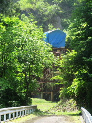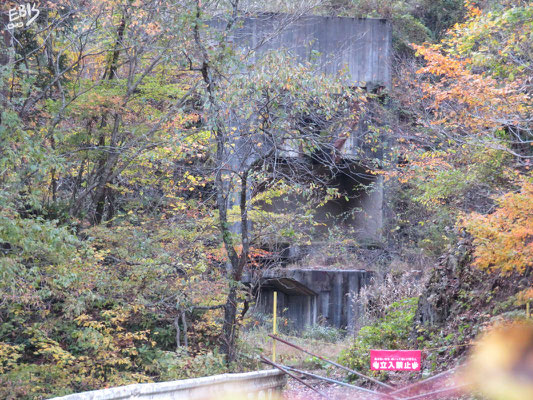 昭和38年(1958年)、大洪水により閉山を余儀なくされたが、今は赤レンガの煙突が痛々しく残っている。